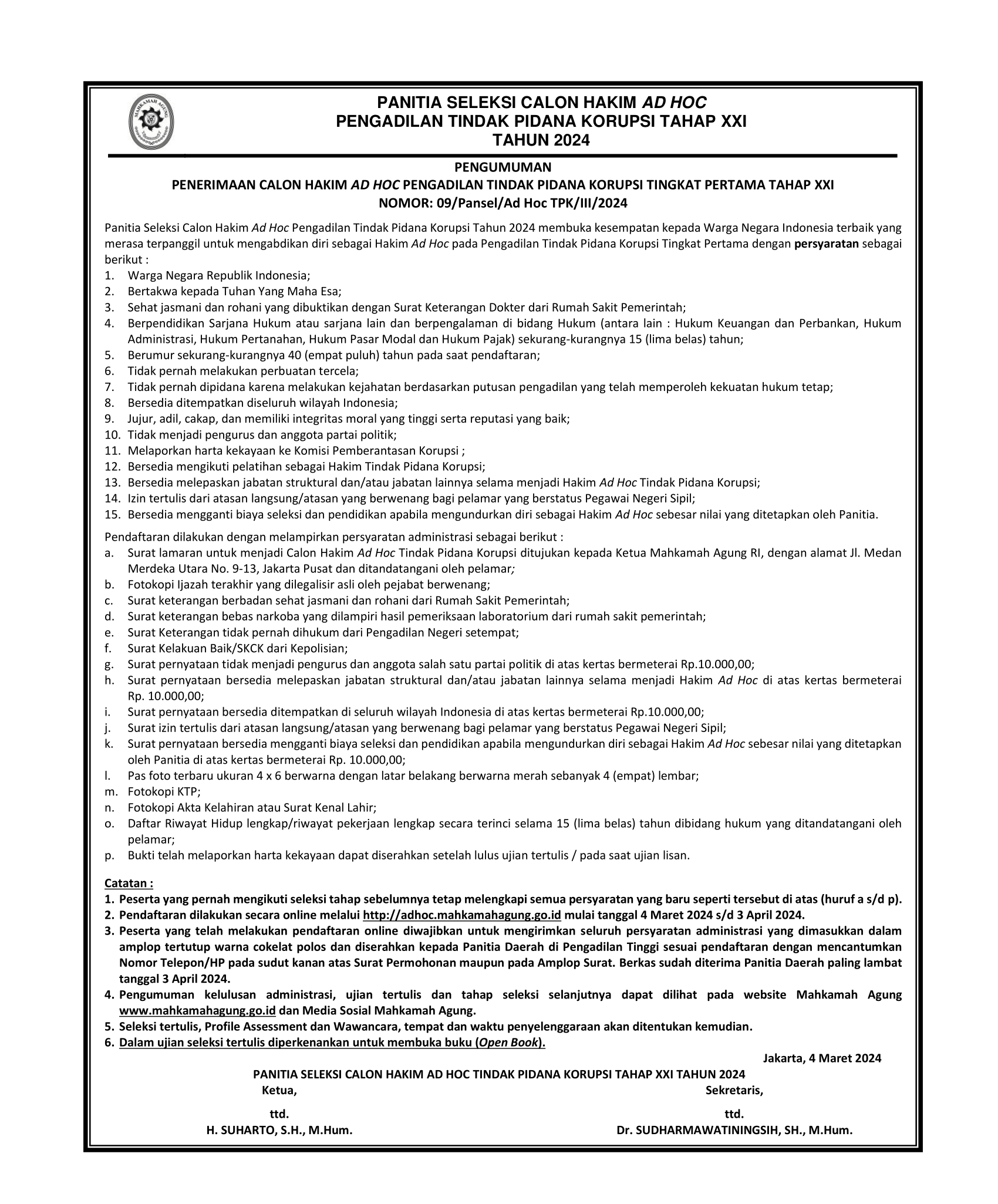 Mahkamah Agung melalui Panitia Seleksi Calon Hakim Ad Hoc Pengadilan Tindak Pidana Korupsi Tahun 2024 membuka kesempatan kepada Warga Negara Indonesia terbaik yang merasa terpanggil untuk mengabdikan diri sebagai Hakim Ad Hoc pada Pengadilan Tindak Pidana Korupsi Tingkat Pertama.