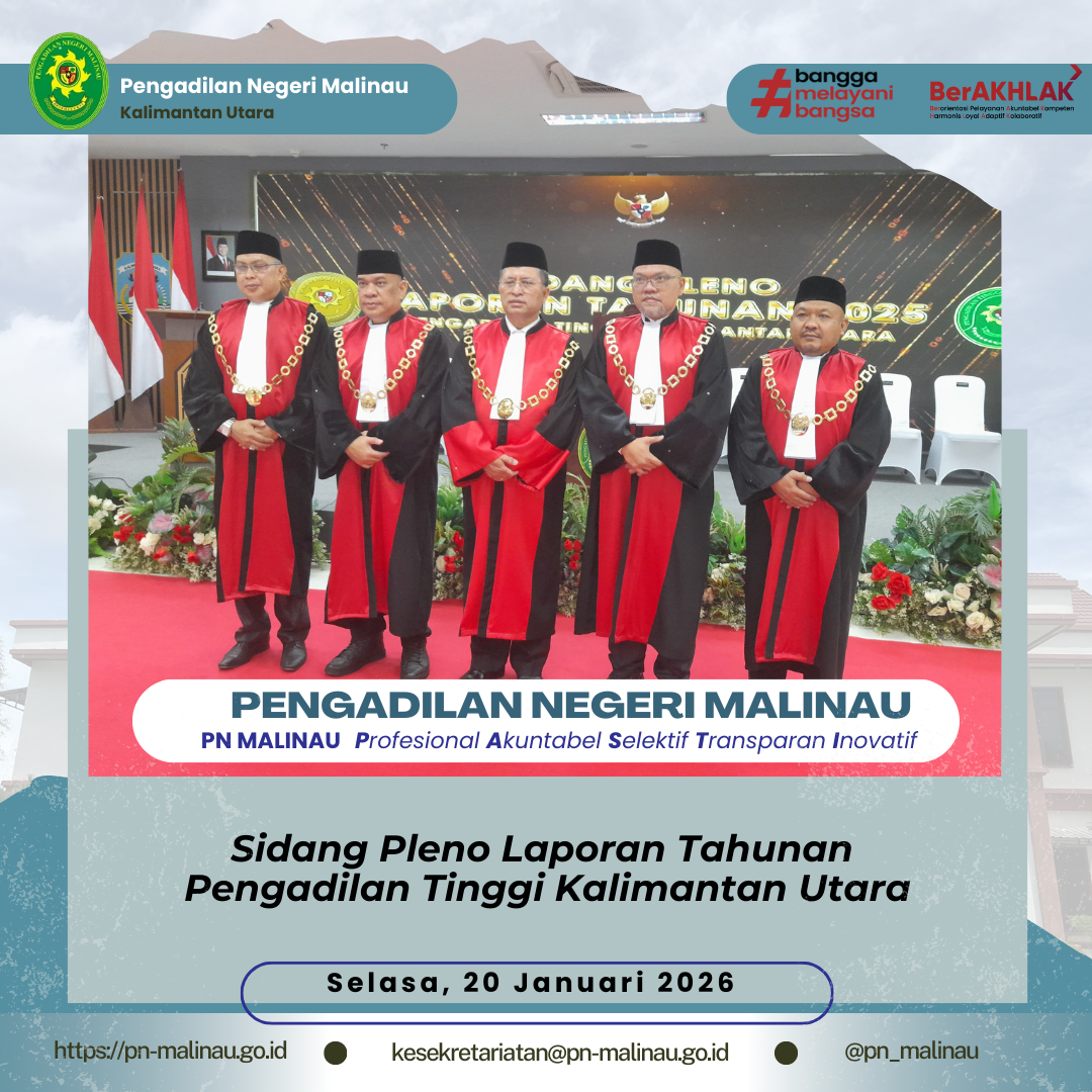 Tanjung Selor – Ketua Pengadilan Negeri Malinau menghadiri kegiatan Sidang Pleno Laporan Tahunan Pengadilan Tinggi Kalimantan Utara Tahun 2025 yang diselenggarakan pada Selasa, 20 Januari 2026 bertempat di Aula Gedung Kantor Gubernur Kalimantan Utara, Tanjung Selor.