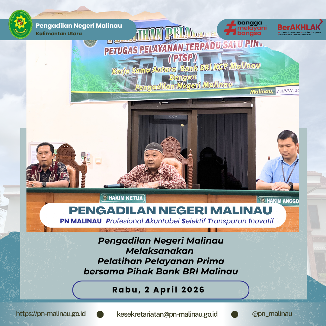 Pengadilan Negeri Malinau melaksanakan kegiatan Pelatihan Pelayanan Prima bagi Petugas Pelayanan Terpadu Satu Pintu (PTSP) bekerja sama dengan pihak Bank BRI KCP Malinau pada Rabu, 2 April 2026.